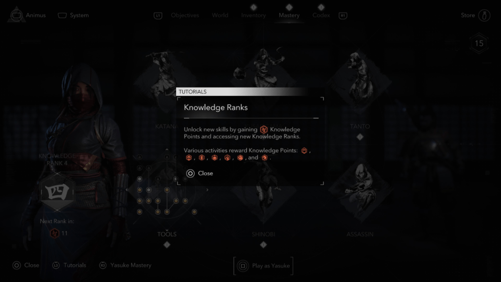 Su conocimiento rango avances al acumular un número establecido de puntos de conocimiento. A medida que avanza, los puntos requeridos para alcanzar el siguiente nivel aumentan, pero no temen: hay numerosas actividades disponibles para Naoe y Yasuke para participar en el vasto paisaje de Japón feudal.