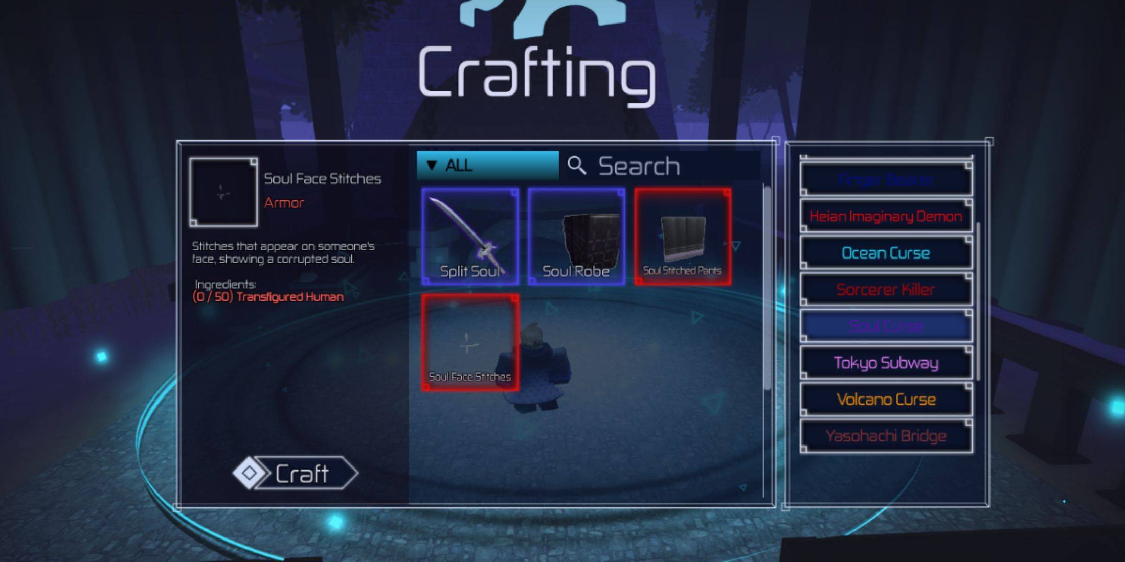 Soul Face Stitches | Health: +0, Strength: +0, Technique: +57.2, Ability: Kokusen | Legendary chest drop from Soul Curse raid; Craftable from 50 Transfigured Humans |