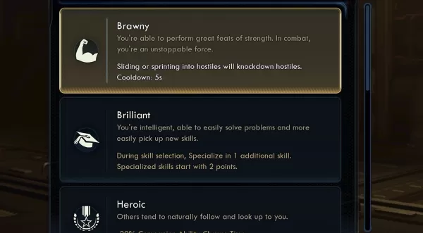 该游戏引入了一个正面和负面特征的系统,其中选择负面特征允许额外的积极特征。例子包括Brilliant,它可以在角色创建方面授予额外的技能点,或者勇敢,使您能够通过冲入目标来击倒目标。为了获得更多的积极因素,玩家可能会选择诸如Dumb之类的负面因素,这可以防止投入五个技能或生病的人,从而降低基础健康和毒性耐受性。这些只是在早期阶段观察到的一些选择。